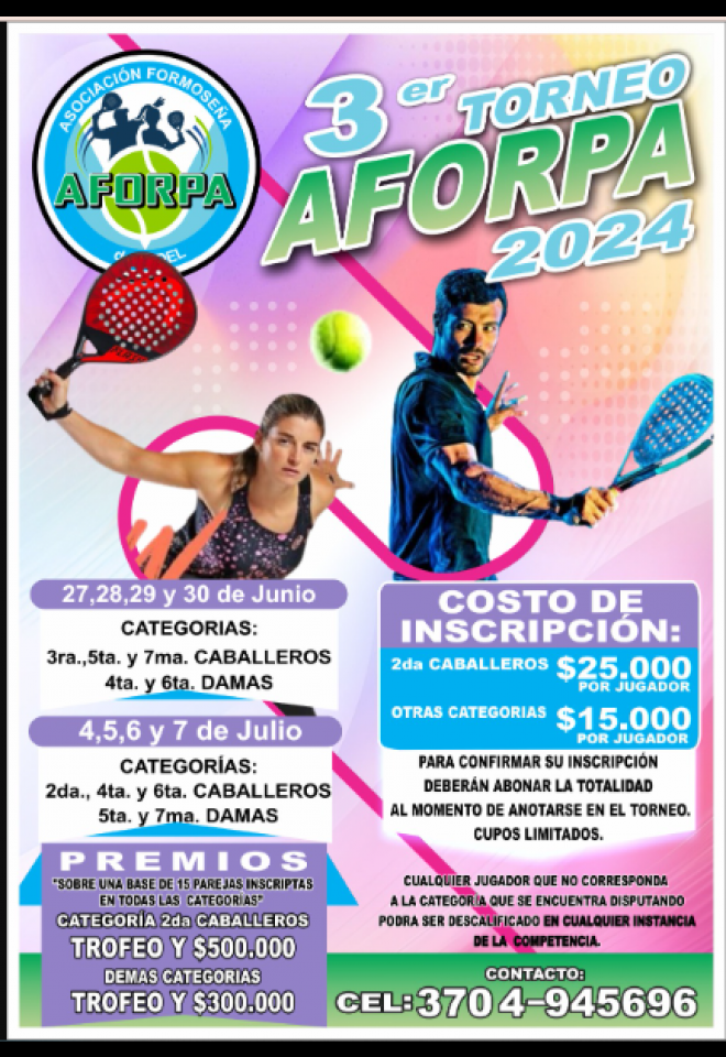 »» Evento: 3er TORNEO AFORPA 2024 - C3/5/7 D4/6 »» Localidad: Formosa »» Fechas: 27/06/2024 al 30/06/2024
